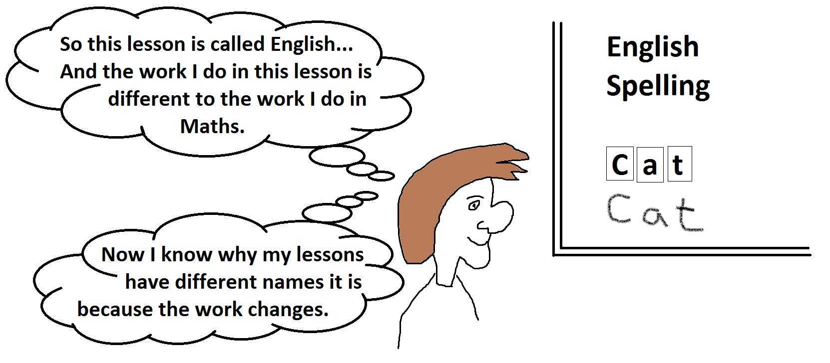 Even if the student starts out with no knowledge or understanding at all in relation to the meaning of each Subject and Topic being studied, by giving them this information (Subject and Topic) everyday as part of a routine at the start of each lesson throughout the day will help them building those important connections in knowing that; each time they see and hear the Subject and Topic information their studies will commence in a certain way which in turn builds familiarity through this process of routine by; the words they are seeing and hearing in relation to the work in which they are participating and therefore making it possible for them to develop a healthy knowledgeable understanding in being able to mindfully identify; what work they will be expecting to study from the moment the Subject and Topic information is announced to them.