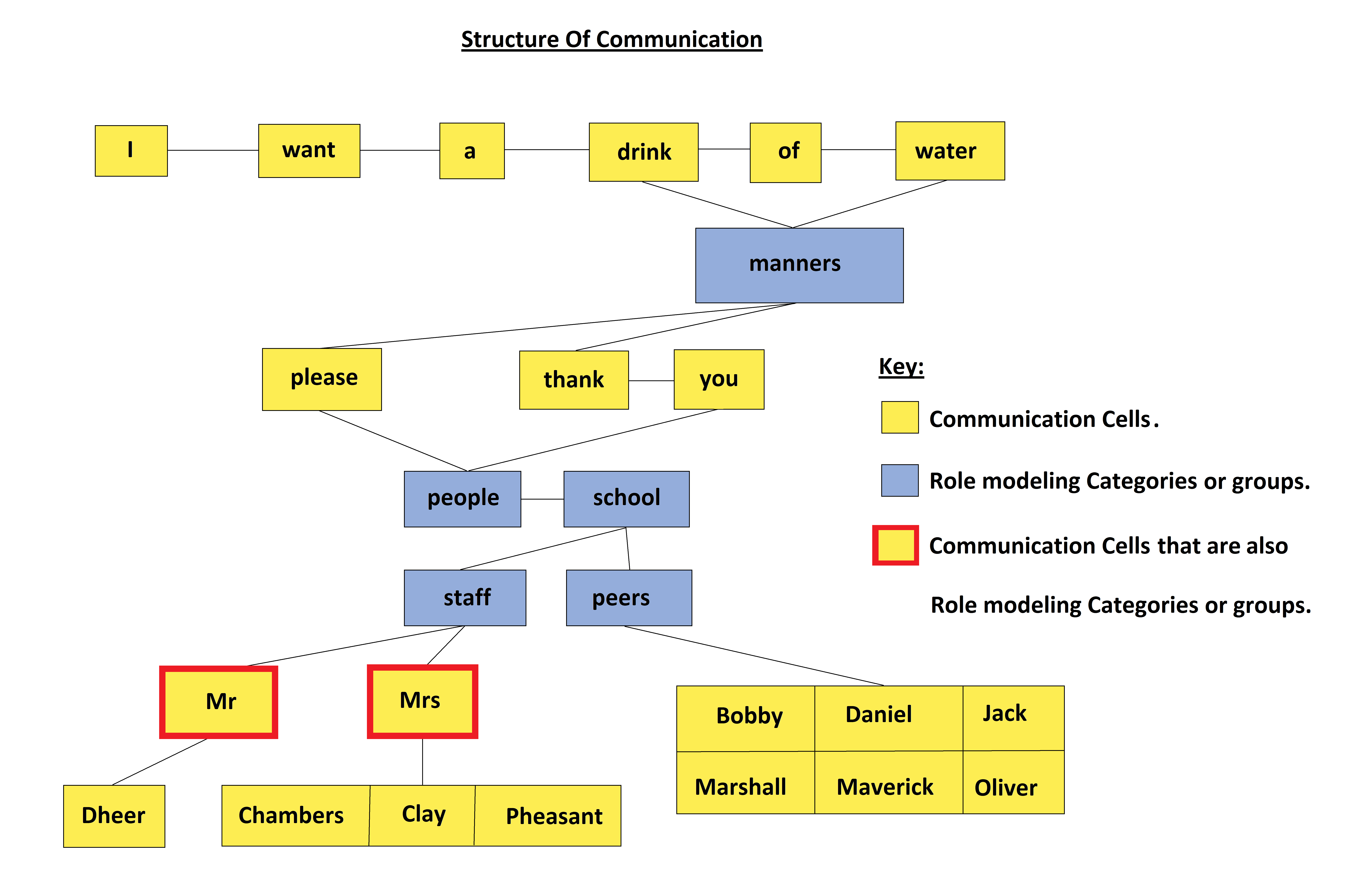 The above diagram is an example of the communication structure that shows how a sentence is constructed (using the yellow speaking cells that are assembled in sequential order onto the workspace as they are selected) and how these categories and groups are role modeled (using the blue cells which speak as they are selected but do not go into the workspace) with the end result displaying the completed sentence in the workspace which can then be broadcasted in its entirety when the ‘Speak’ button is pressed.