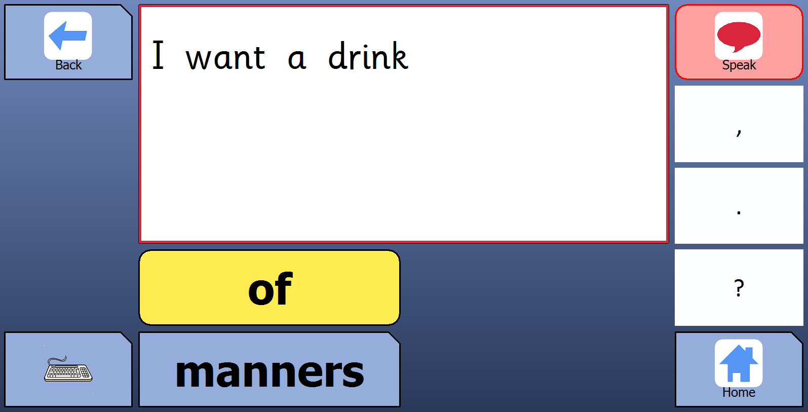 Seeing and hearing the ‘manners’ group during the sentence construction is good for the purposes of role modeling, however when the sentence is completed and the ‘Speak’ button is pressed the sentence sounds both correct and meaningful by only displaying and speaking the relevant information about the request:
