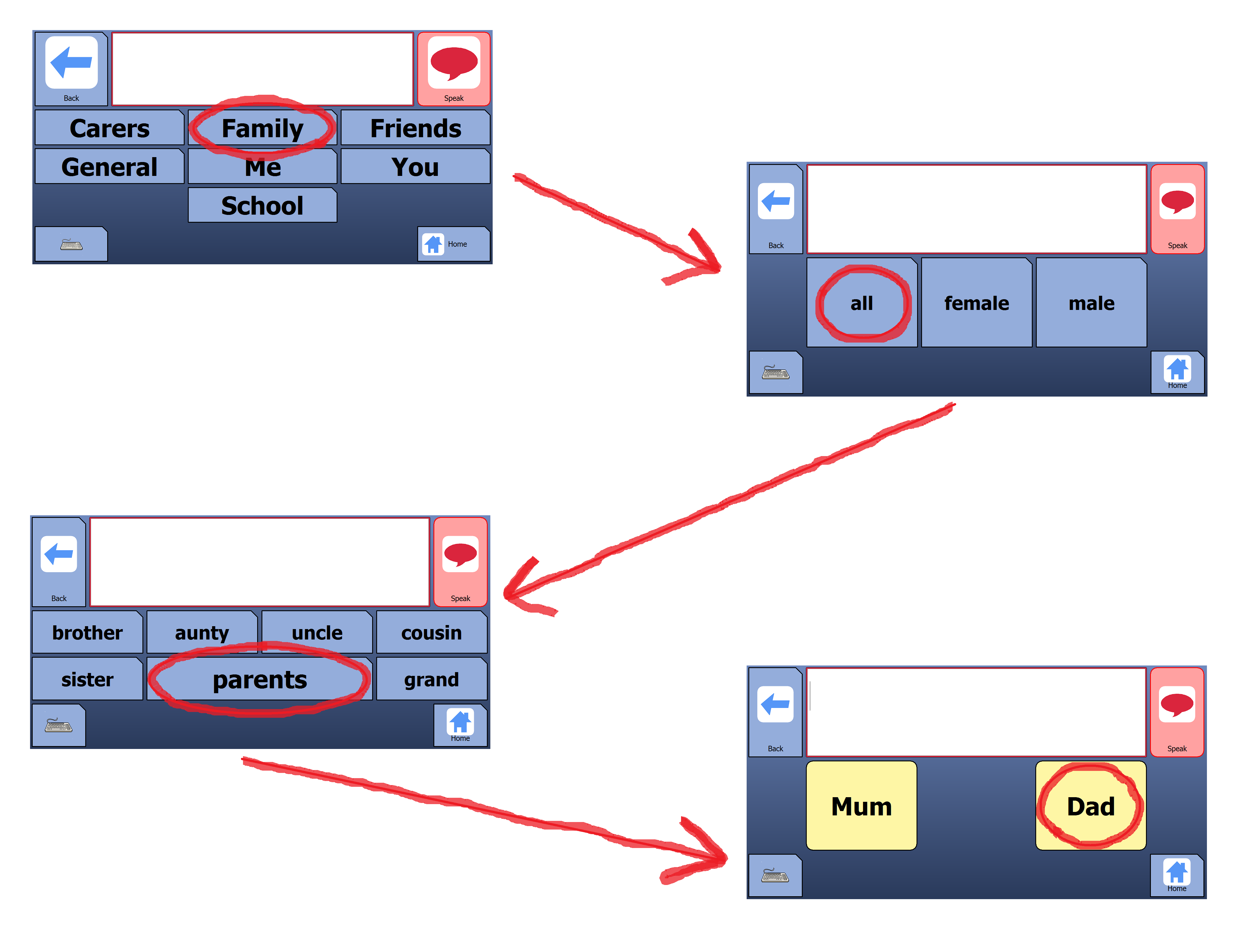 While on first look this may just seem like a reasonable way to present this type of information after a deeper examination over a period of time it has proven its worth by raising awareness in the students long term understanding which increases every time the student chooses a persons name for example like choosing ‘Dad’ because they are also hearing and seeing the other information which they are first required to navigate through ‘People’, ‘Family’ and ‘Parents’ which in turn role models the understanding in that whenever the student hears the word “Parents” spoken by other people they are then able to remember the information relevant to the categorized groups and choices they have followed (which leads them to ‘Dad’ and ‘Mum’) so the student then becomes aware (in Lia’s case) and understands that ‘Dad’ and ‘Mum’ are ‘grouped’ as ‘parents’ and that ‘Mia’ for example would be ‘grouped’ as her ‘sister’ and also that all of these three people are ‘categorized’ as ‘family’.