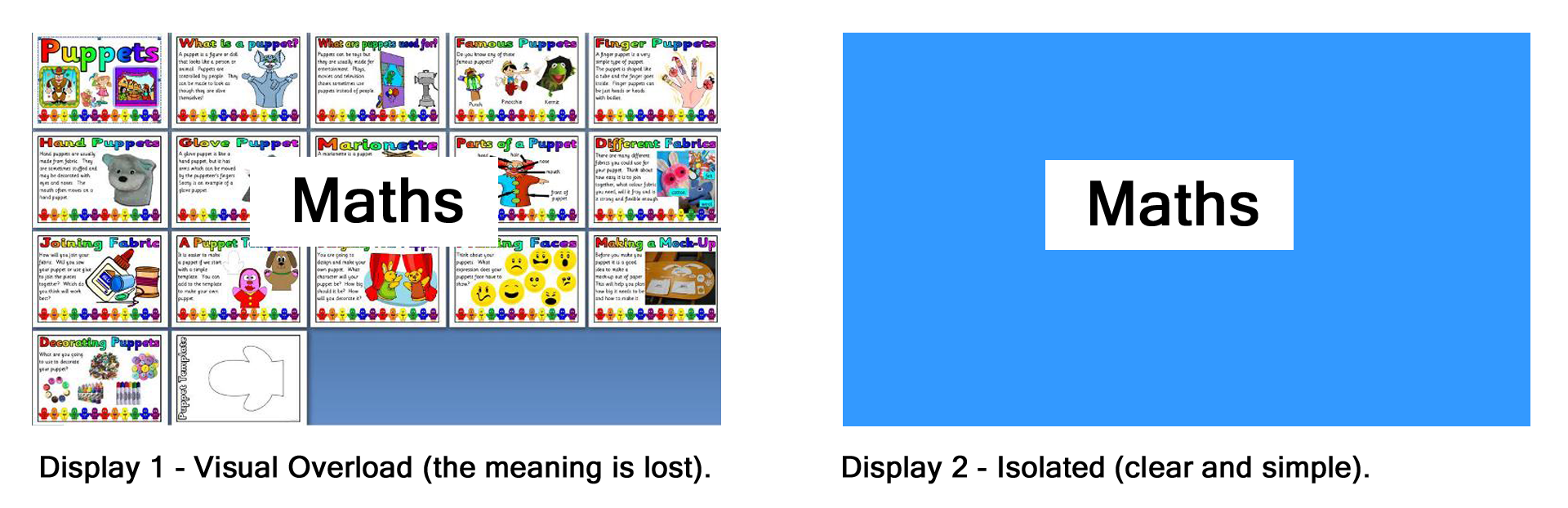 • Depending on the students level of understanding start out with just two words (Subject and Topic for example: Maths and Shapes). If the student is not yet ready for two words then start out with one word (Subject example: Maths). Never use more than two words until there is undisputable proof that the student is ready to process more additional information without it causing visual overload.